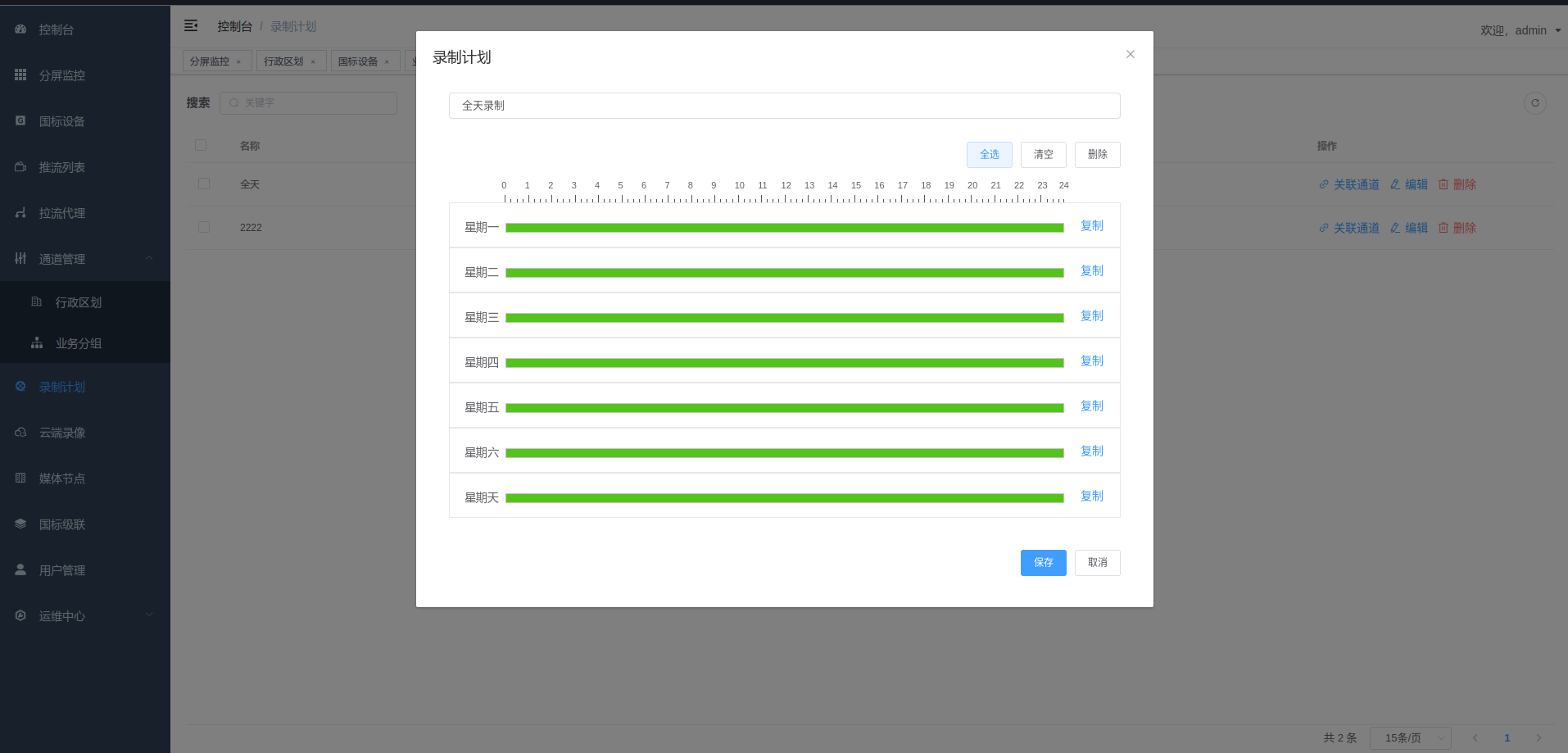• 支持录制计划, 根据设定的时间对通道进行录制. 暂不支持将录制的内容转发到国标上级